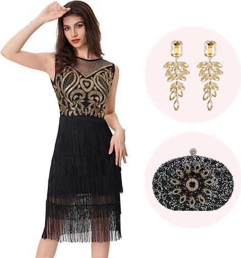Black And Blue Sequined Fringes 1920S Gatsby Flapper Dress With 20S Accessories Set - Black Blue / L